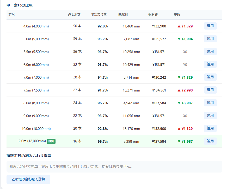 - 「最適定尺を提案」 → 複数の定尺から最も歩留まりの良い組み合わせを自動提案