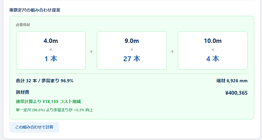 さらに「4m + 9m + 10m」のような 複数定尺の組み合わせ提案 にも対応しているので、単一定尺では出せない最適解が見つかります。