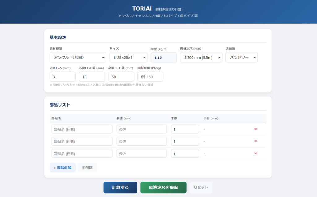 - 本ツールは鋼材の歩留まり計算を補助する目的で提供しています。計算結果はあくまで参考値であり、実際の発注・施工の際は必ずご自身で内容をご確認ください。